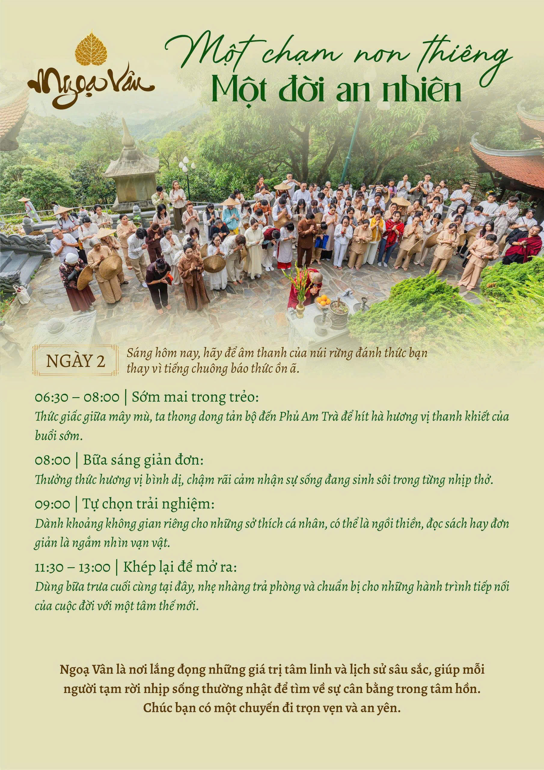 Chương trình được thiết kế với nhịp độ nhẹ nhàng, đan xen giữa trải nghiệm – nghỉ ngơi – chiêm nghiệm, giúp hành trình trở nên trọn vẹn và dễ chịu hơn.